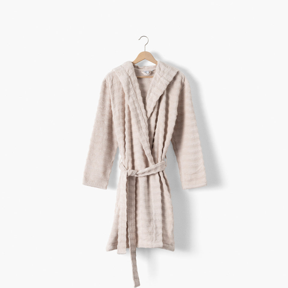 Women's hooded bathrobe in soft beige cotton, Aura